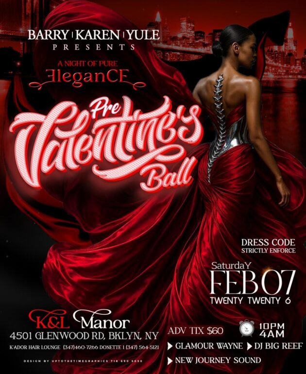 Barry | Karen | Yule proudly present The Pre Valentine’s Ball – A Night of Pure Elegance, an unforgettable evening of luxury, style, and sophisticated vibes. Step into a world of glamour on Saturday, February 7th, 2026 at the stunning K&L Manor, 4501 Glenwood Rd, Brooklyn, NY, and experience a celebration designed for those who appreciate class, culture, and premium entertainment.